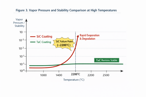 अतुलनीय थर्मोडायनामिक स्थिरता: टँटलम कार्बाइड (TaC) 3880°C च्या आश्चर्यकारक वितळण्याच्या बिंदूचा अभिमान बाळगतो. जर्नल ऑफ क्रिस्टल ग्रोथ मधील संशोधनानुसार, SiC कोटिंग्ज 2200°C पेक्षा जास्त "विसंगत बाष्पीभवन" सहन करतात - जिथे सिलिकॉन कार्बनपेक्षा अधिक वेगाने उत्तेजित होते, ज्यामुळे संरचनात्मक ऱ्हास आणि कण दूषित होते. याउलट, TaC चा बाष्प दाब 3 ते 4 आहेक्रिस्टल वाढीसाठी मूळ थर्मल फील्ड राखून, SiC पेक्षा कमी परिमाणाचे ऑर्डर.